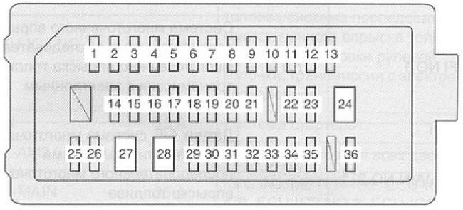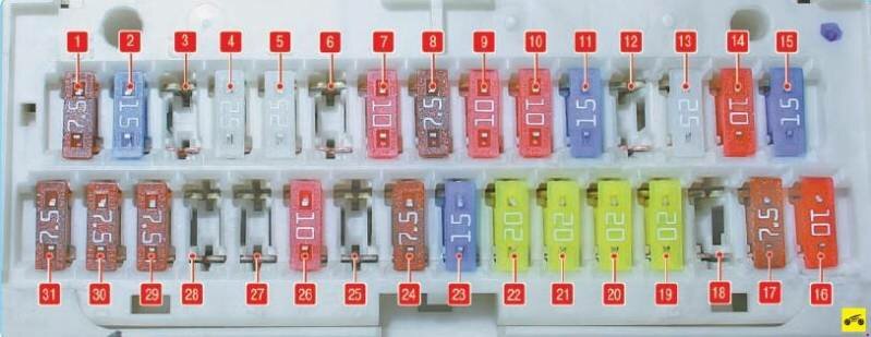 Реле и плавкие вставки в монтажном блоке, расположенном в салоне авто