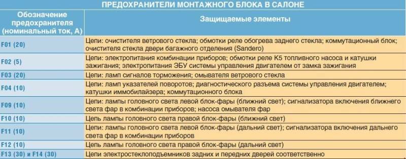 Цепи, защищаемые предохранителями в салоне Рено Символ