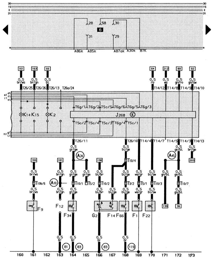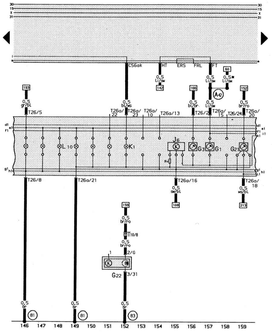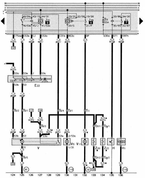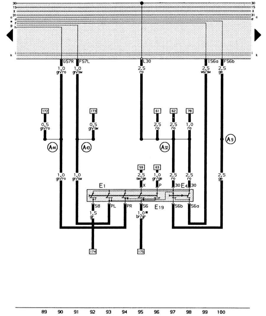 Лямбда-зонд с подогревом, электромагнитный клапан бачка с активированным углем, регулятор положения дроссельной заслонки. Цвета проводов: br – к, br/ge – к/ж, bl/sw – сн/ч, gn/sw – з/ч, sw – ч, gr/sw ср/ч, ro/ge – кр/ж, gr/ws ср/б, sw/ro – ч/кр, ge – ж, br/sw – к/ч, sw/bl – ч/сн, li/sw – л/ч, li – л, ro/sw кр/ч.