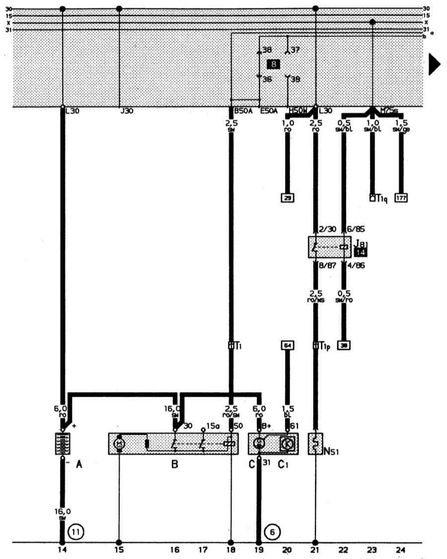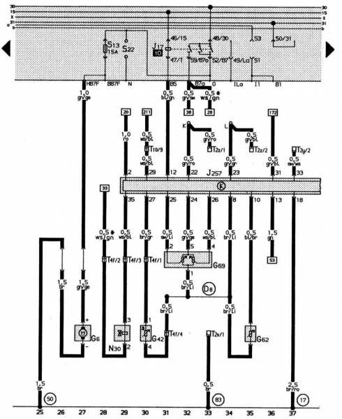 Топливный насос, система впрыска, блок управления системой впрыска Mono-Motronic. Цвета проводов: br – к, gn/ge – з/ж, ws/gn – б/з, ws/bl – б/кр, ro – кр, br/gr – к/ср, sw/li ч/л, br/li – к/л, bl/br – сн/к, gn – з, br/ro – к/кр, bl/gn – с/з, gn/ro -/кр, gn/sw – з/ч, gn/gr – з/ср, gn/bl – з/сн, sw/ws – ч/б.