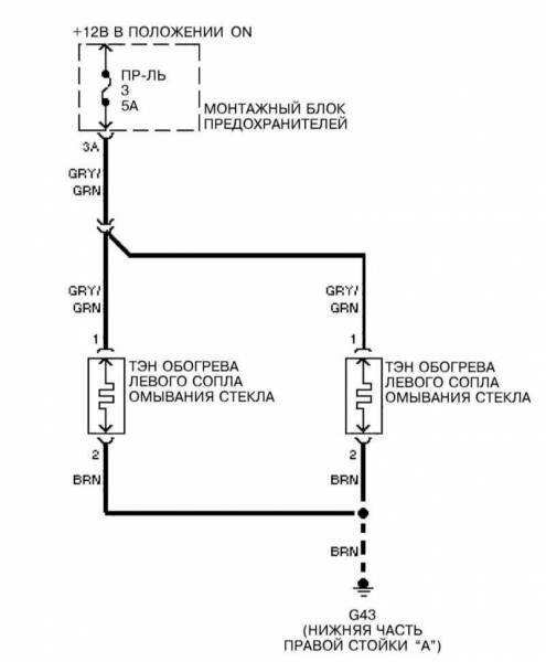 Электросхема обогрева сопел подачи омывающей жидкости