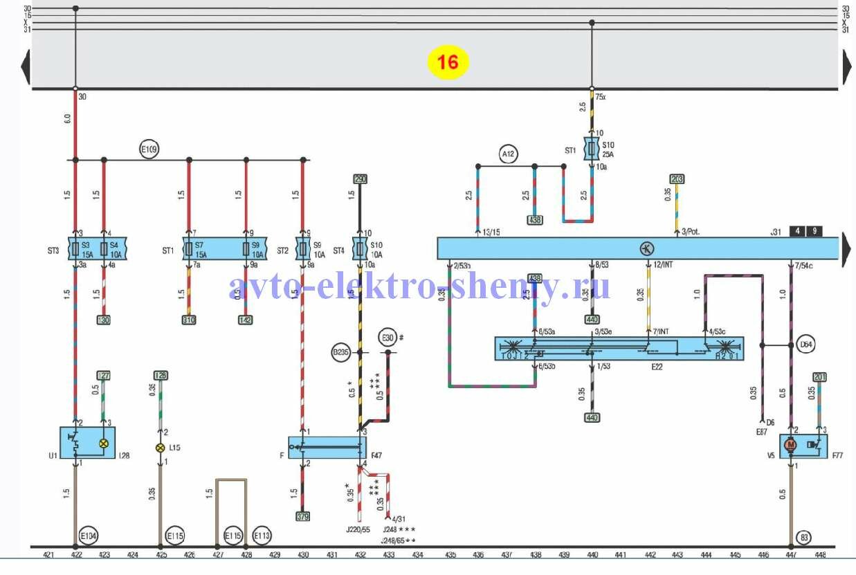 Q12 – соединение положительное (30a), в электропроводке стеклоподъемник/ система замков с центральным управлением и дверной выключатель освещения
