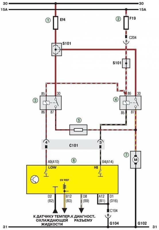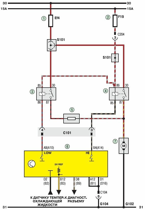 1 - плавкая вставка (30 А); 2 - плавкая вставка (80 А); 3 - реле дополнительного вентилятора системы охлаждения двигателя; 4 - реле основного вентилятора системы охлаждения двигателя; 5 - резистор; 6 - электронный блок управления двигателем; 7 - электровентилятор системы охлаждения двигателя Daewoo Lanos.