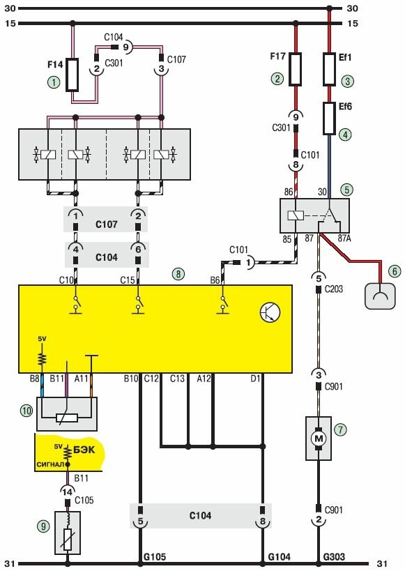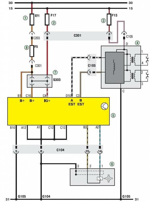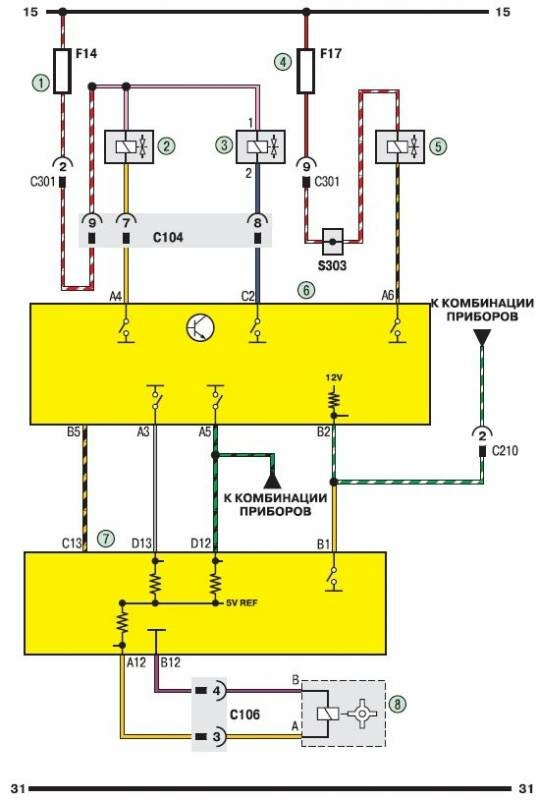 1 - предохранитель (15 А); 2 - электромагнитный клапан рециркуляции отработавших газов; 3 - двухходовой клапан; 4 - предохранитель F17 (15 А); 5 - гравитационный клапан; 6 - электронный блок управления двигателем; 7 - комбинация приборов; 8 - датчик скорости автомобиля (для автомобилей, оснащенных автоматической коробкой передач).