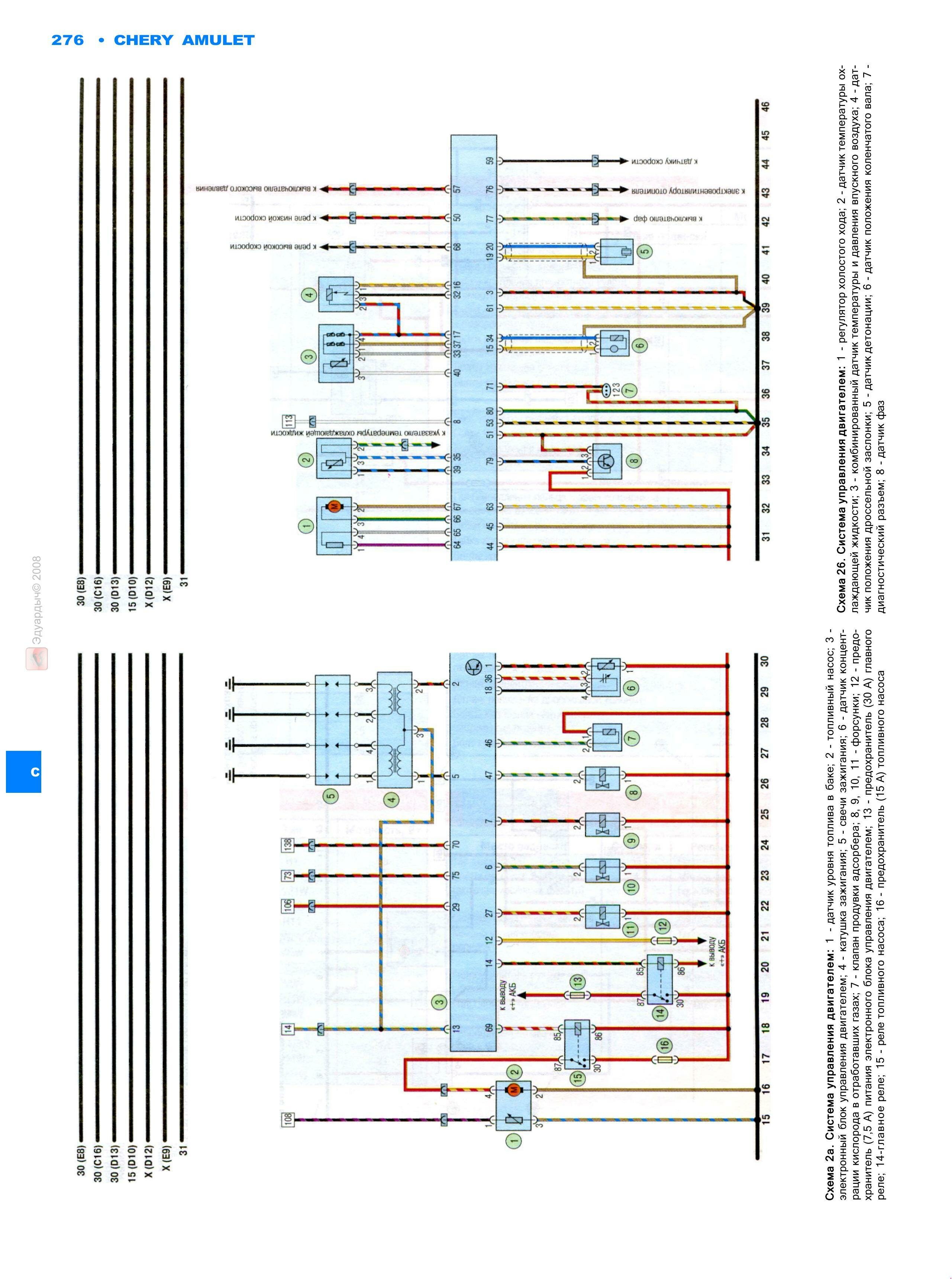 Предлагаем вашему вниманию цветные схемы электрооборудования на Чери Амулет с 2006 г.в. и младше. Экономичный и неприхотливый двигатель объемом 1.6 л. мощностью 94 л.с., работающий на бензине АИ-92 позволит экономить на эксплуатационных расходах. Современная система активной и пассивной безопасности включает в себя 4-х канальный ABS, ремни безопасности для всех пассажиров и 2 фронтальные подушки безопасности.