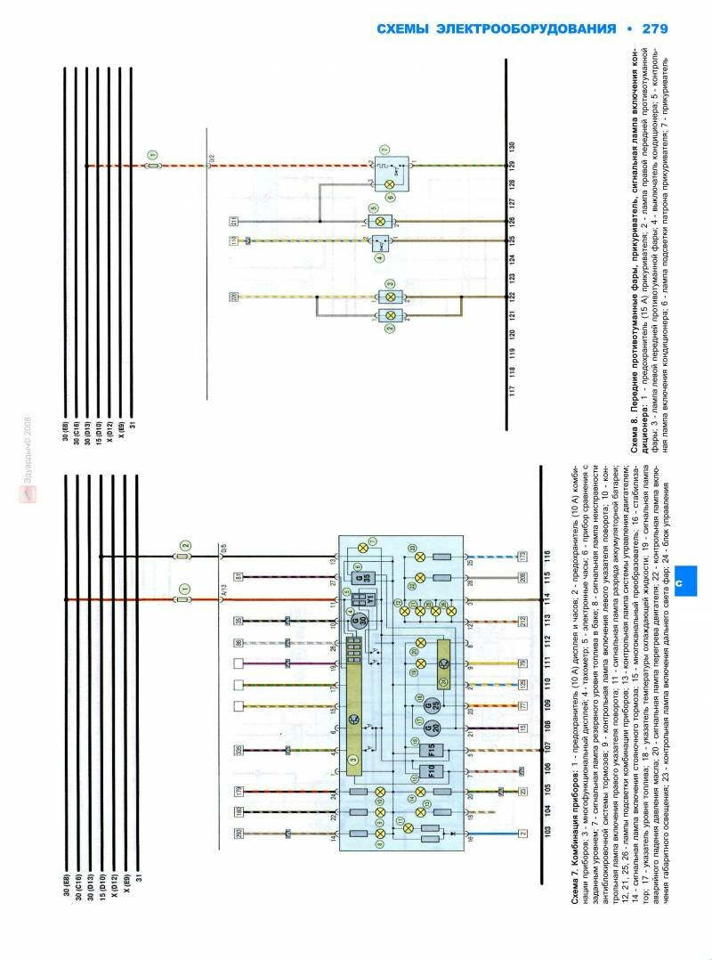 Электросхема передних противотуманных фар, прикуривателя, сигнальной лампы включения кондиционера, комбинации приборов