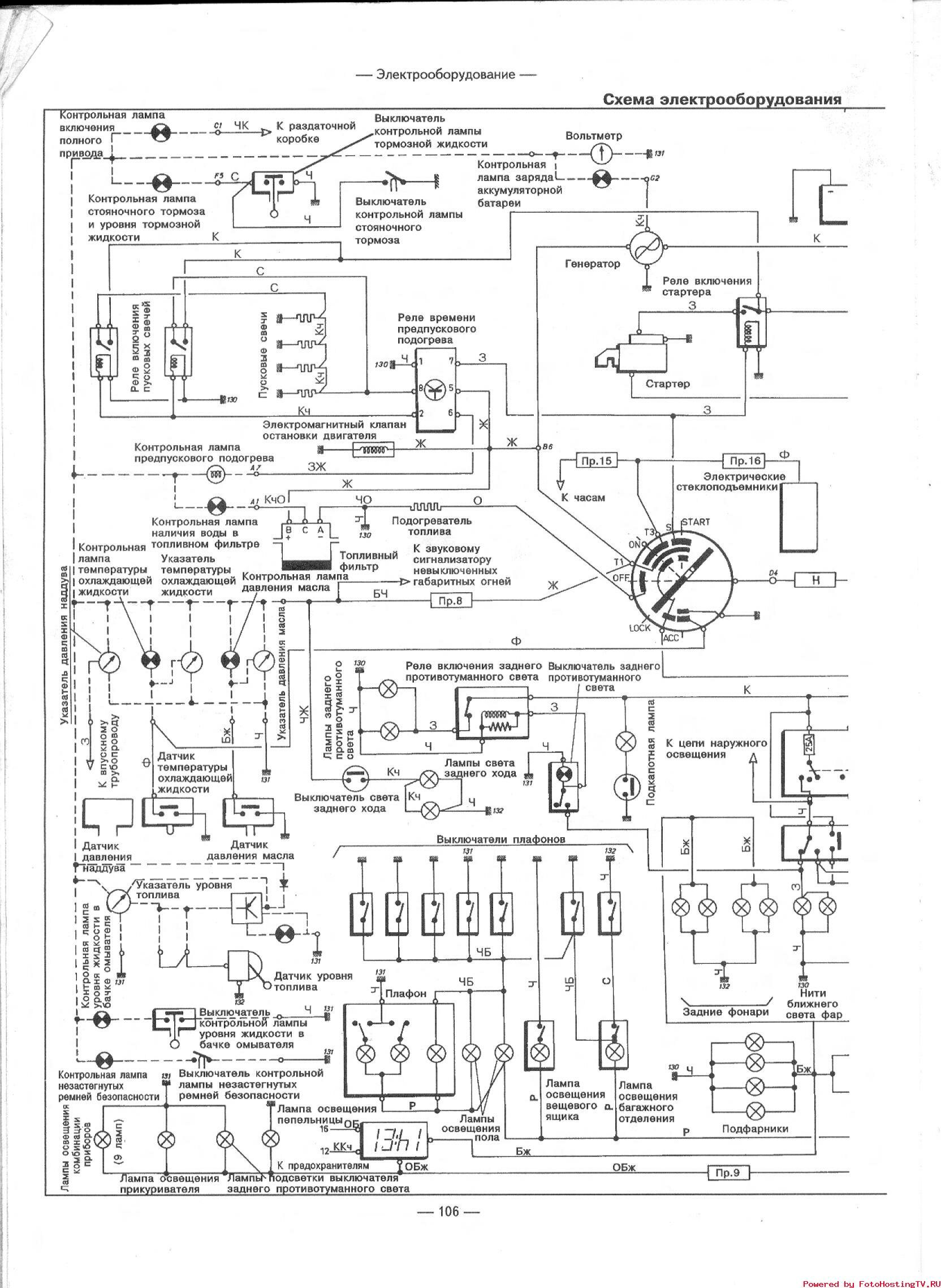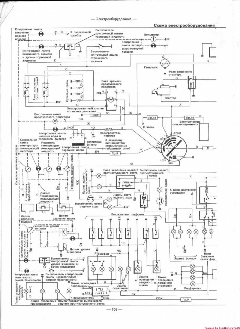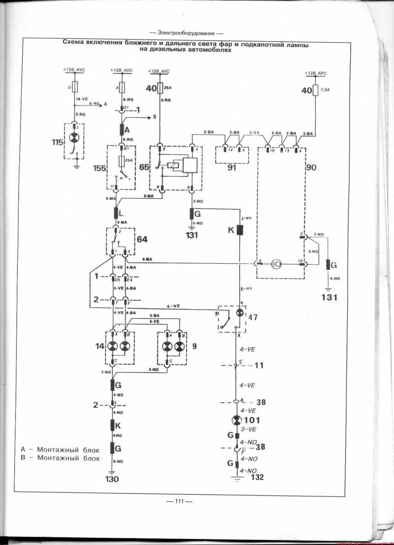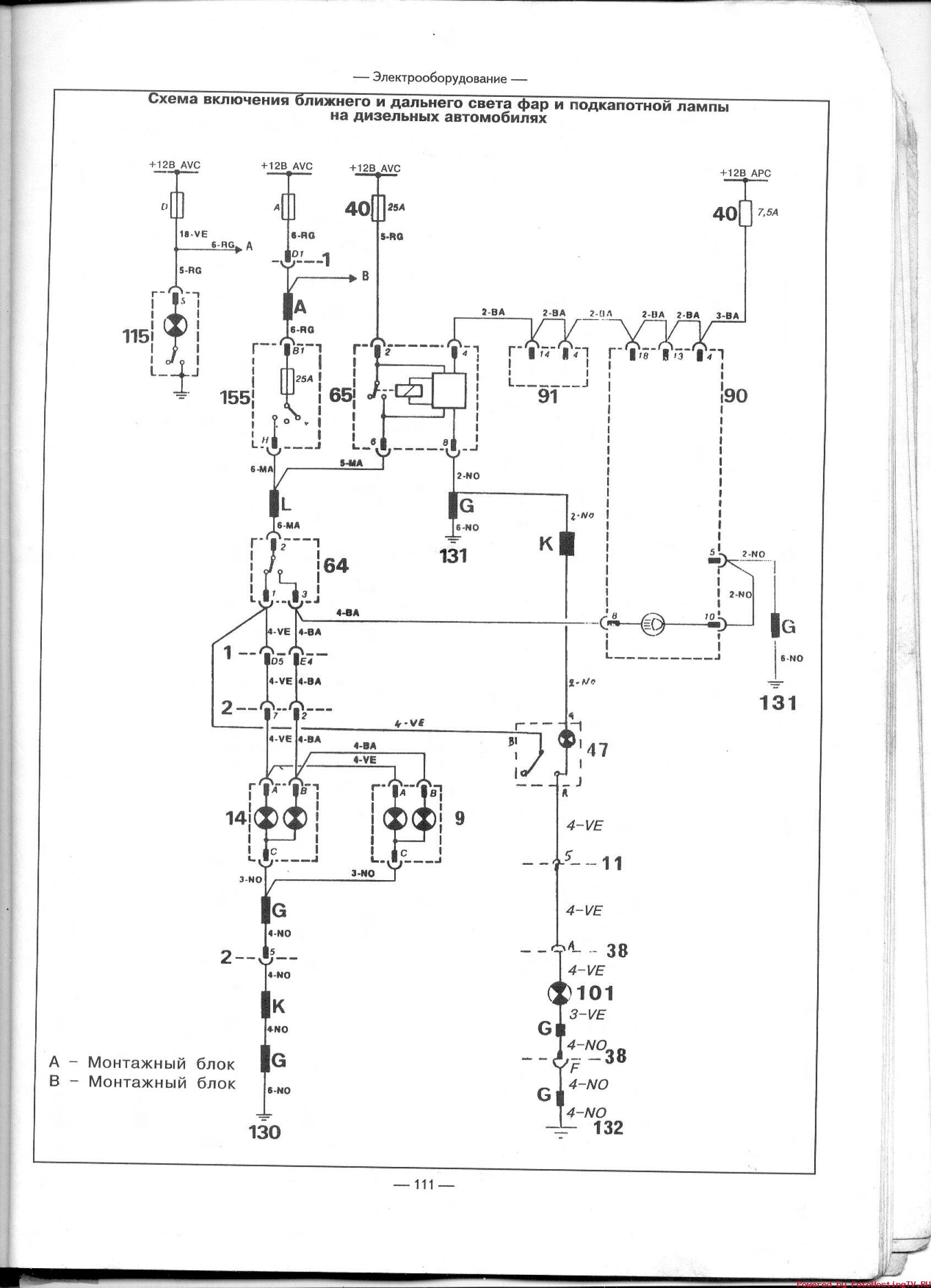 Эл.схема включения ближнего и дальнего света фар и подкапотной лампы