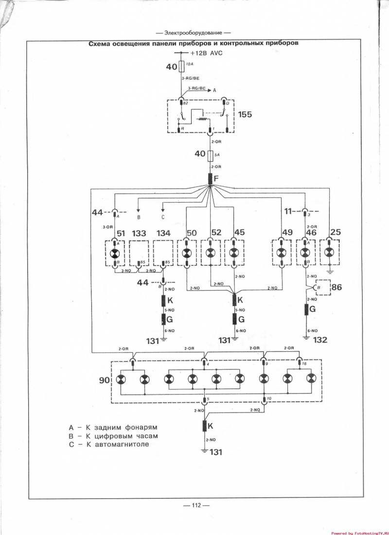 Схема освещения панели приборов и контрольных приборов