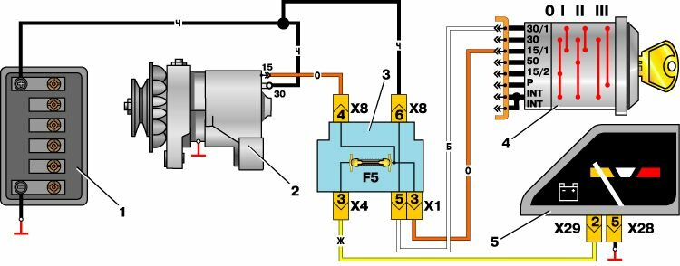 3 – блок предохранителей и реле; 4 – выключатель зажигания;