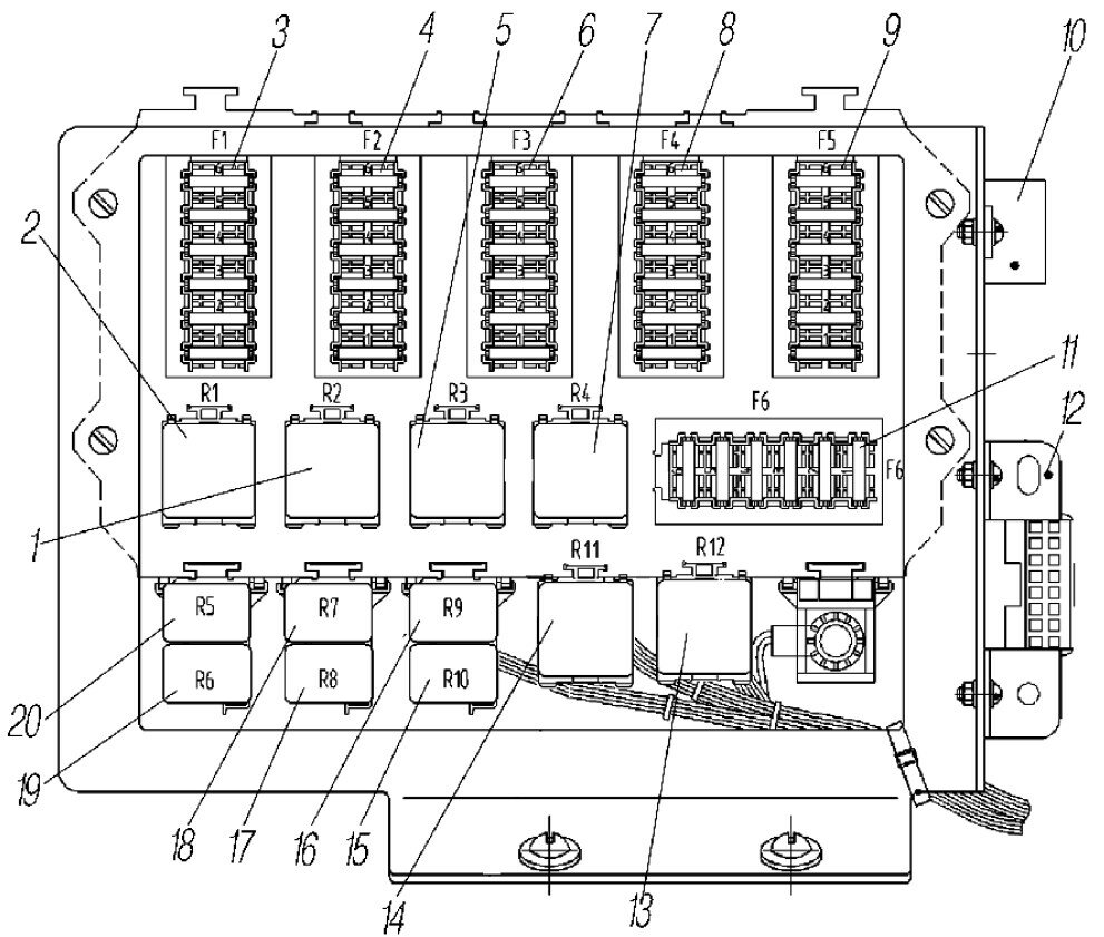 1-реле разгрузки клеммы «15» (Р2); 2-реле стартера (Р1); 3, 4, 6, 8, 9, 11-блоки предохранителей; 5-реле разгрузки клеммы «15» (R3); 7-реле стеклоочистителя (R4); 10-реле задних противотуманных огней; 12-разъем диагностики; 13-реле выключателя пневматического сигнала торможения (R12); 14-реле обогрева зеркал (R11); 15-реле сигнала стоп (R10); 16-реле звуковых сигналов (R9); 17-реле дальнего света (R8); 18-реле ближнего света (R7); 19-реле габаритных огней (R6); 20-реле дополнительное задних противотуманных огней (R5).