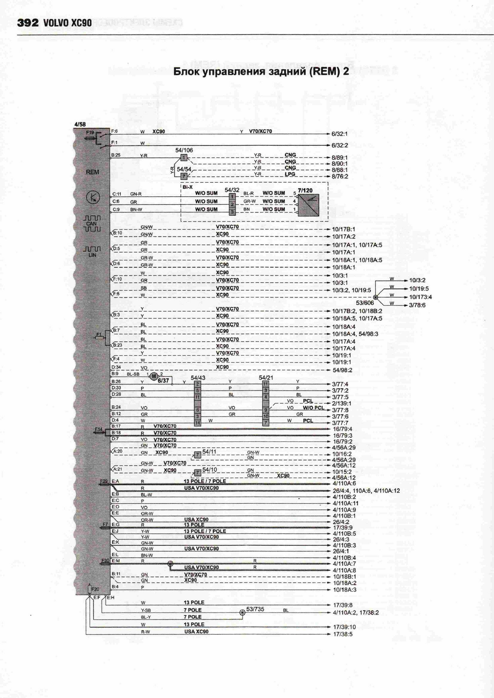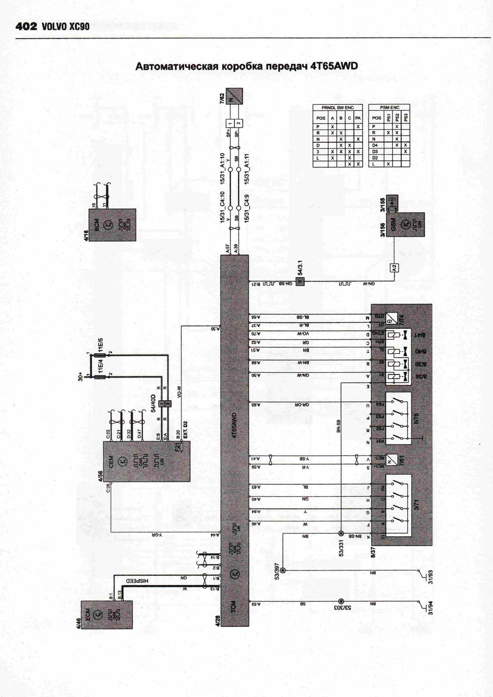 Принципиальные схемы электрооборудования автомобиля VOLVO XC90 с 2002 (двигатели типов бензин 2,5, 2,9, 3,2, 4,4 л и дизель 2,4). Продолжение сборника схем находится здесь. Volvo XC90 - это внедорожник, построенный по принципу пассажирского автомобиля. Он имеет несущий кузов, продуманную систему зон деформации, низкий центр тяжести и передовые системы безопасности, сводящие к минимуму возможность травм у водителя и пассажиров, вне зависимости от аварийной ситуации и силы столкновения. Более того, Volvo XC90 оборудован системой, предотвращающей опрокидывание автомобиля. Система RSC (система защиты от опрокидывания) включает гироскоп, который следит за перемещением автомобиля на дороге и фиксирует опасные моменты. Если система определяет, что риск опрокидывания действительно актуален, то обороты двигателя автоматически снижаются; затем, при необходимости, происходит притормаживание одного или более колес. Если же избежать опрокидывания не удается, то на помощь людям приходят системы безопасности - ремни безопасности с преднатяжителями и надуваемый занавес.