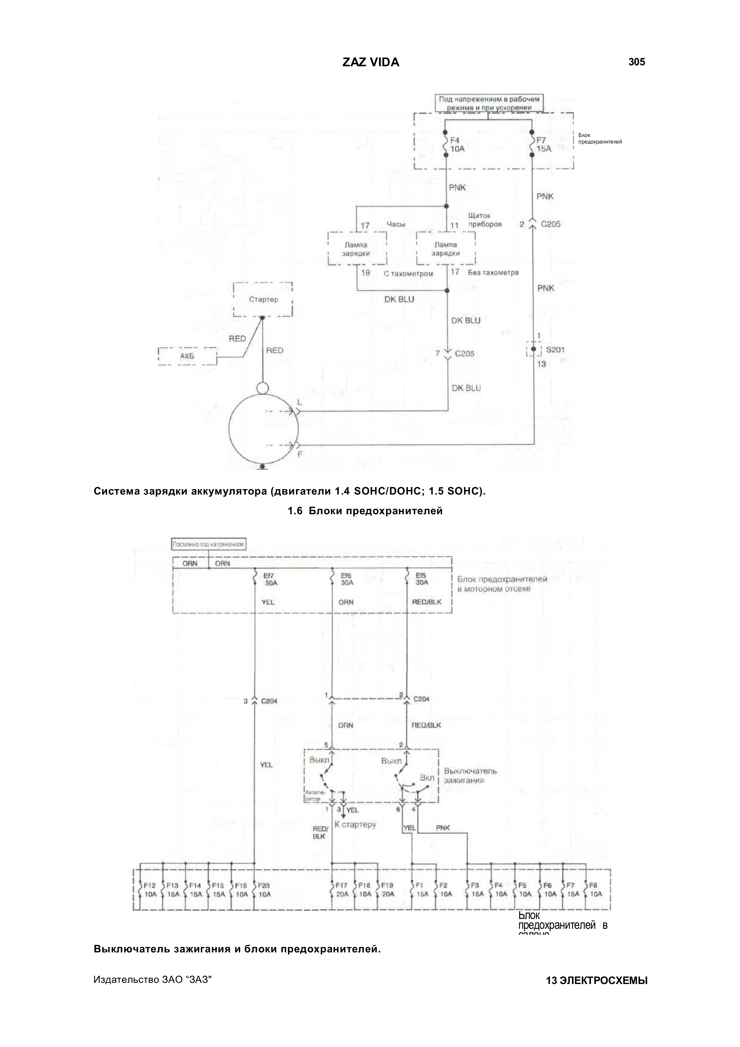 Сборник качественных схем автомобиля Zaz Vida взятых из инструкции по ремонту и эксплуатации. Имеются описания предохранителей,элементов схем и цвета проводников в электропроводке авто Заз Вида. Для увеличения - кликните на схеме.