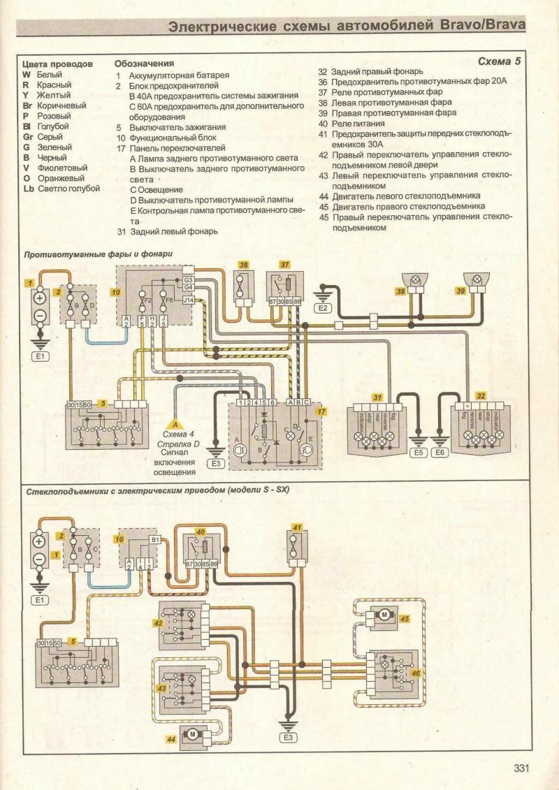 Принципиальные схемы электрооборудования на Фиат Брава 1995-2001 г.в. Пятидверный хэтчбек FIAT Brava выпускался с 1995 года по 2001 год. Родственником ФИАТ Брава является FIAT Bravо, у которого три двери. В 1995 году FIAT Brava получает громкое звание «Европейский Автомобиль Года». Предшественником ФИАТ Брава был автомобиль FIAT Tipo. На базе ФИАТ Брава в 1996 году увидел свет FIAT Marea, а в 1998 году на основе FIAT Brava был создан минивэн FIAT Multipla.