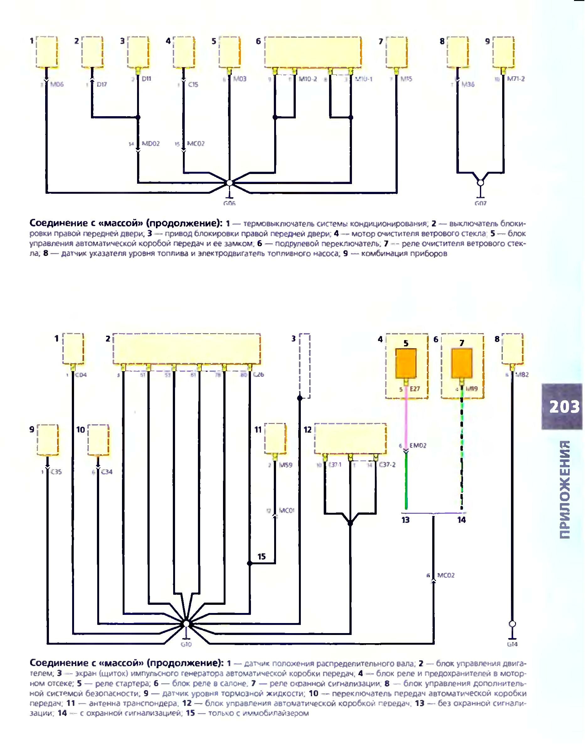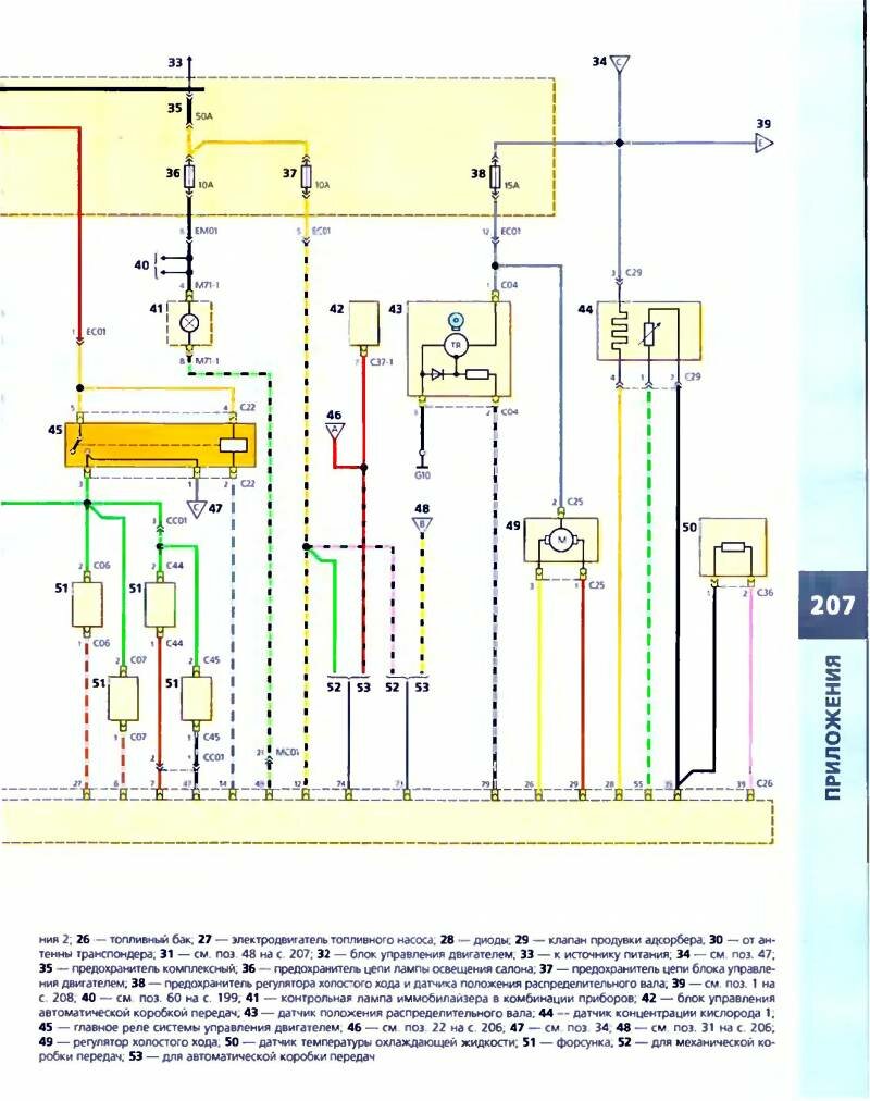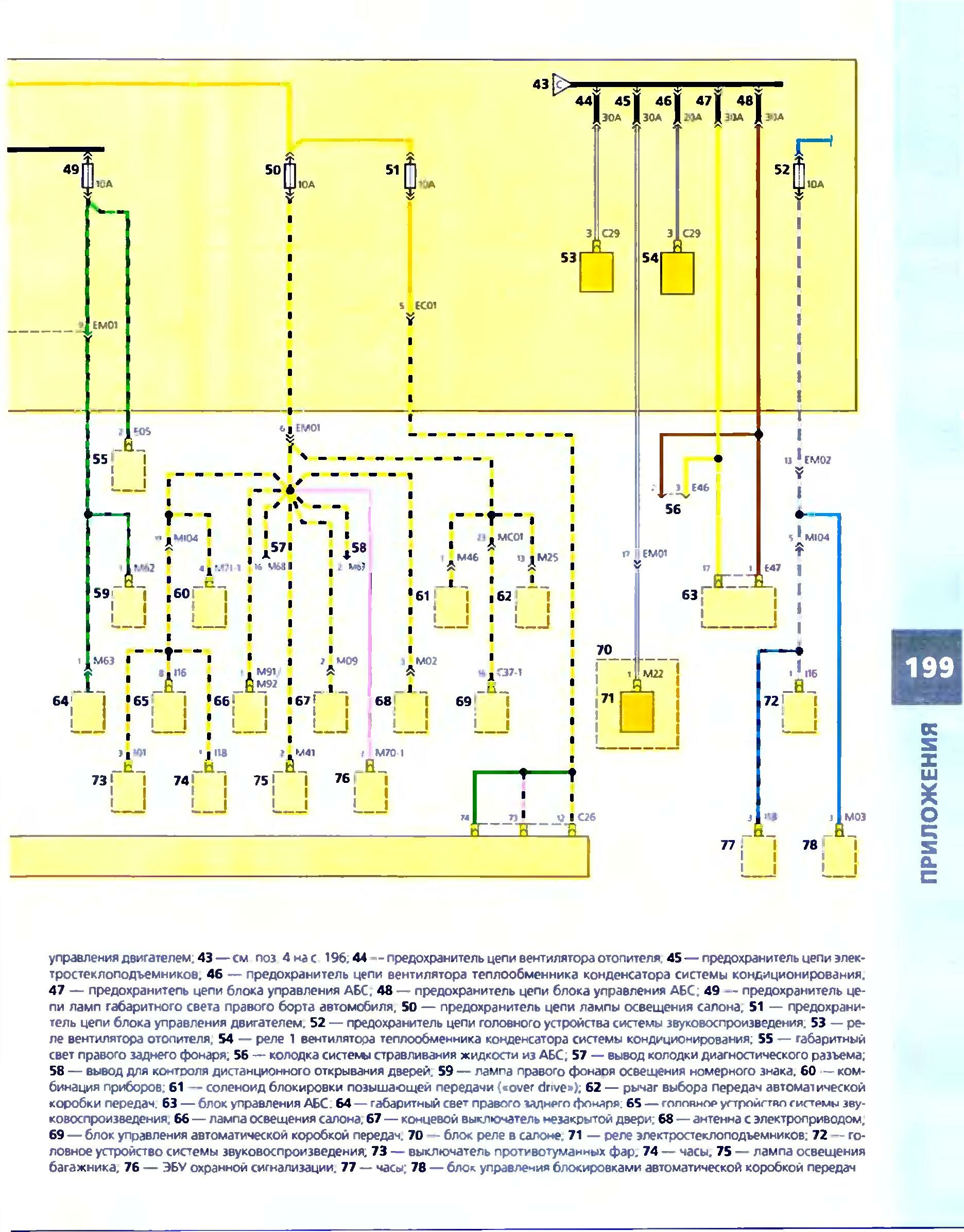 Бесплатный сборник цветных схем на русском языке электрооборудования автомобиля Hyundai Accent (1,5i) с 2000 года выпуска. Тут показан блок реле и предохранителей, а также некоторые другие модули. Продолжение каталога схем читайте далее. Предохранители служат для того, чтобы разрывать цепь, когда сила тока достигнет определенного значения, для того, чтобы защитить элементы и провода, которые могут быть повреждены слишком сильным током. Резкое увеличение силы тока обычно вызвано неисправностью в цепи, чаще всего коротким замыканием. Обозначения цепей, защищаемых предохранителями, указаны на крышке блока предохранителей.