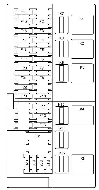 13 – предохранитель цепи питания бензонасоса (15 А)