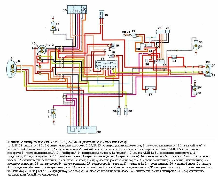 1, 13, 28, 32 - лампы А 12-21-3 фонаря-указателя поворота; 2, 14, 27, 33 - фонари-указатели поворота; 3 - контрольная лампа А 12-1 "дальний свет"; 4 - лампа А 12-4 - стояночного света; 5 - фара; 6 - лампа А 12-45-40 дальнею - ближнего света фары; 7 - контрольная лампа АМН 12-3-1 указателя поворота; 8 - контрольная лампа А 12-1 "нейтраль"; 9 - контрольная лампа А 12 "масло"; 10 - лампа АМН 12-3-1 освещение спидометра; 11 - спидометр; 12 - щиток приборов; 15 - комбинированный переключатель (правый переключатель); 16 - выключатель "стоп-сигнала" тормоза переднего колеса; 17 - выключатель зажигания; 18 - звуковой сигнал; 19 - прерыватель указателей поворота; 20 - свеча зажигания; 21 - свечной наконечник; 22 - катушка зажигания; 23 - коммутатор; 24 - предохранитель; 25 - генератор; 26 - датчик; 29 - лампа А 12-21-4 стоп-сигнала; 30 - задний фонарь; 31 - лампа А 12-5 заднего габаритного фонаря мотоцикла; 34 - выключатель "стоп-сигнала" тормоза заднего колеса; 35 - выпрямитель-регулятор напряжения; 36 - конденсатор 2200 мкф 63В; 37 - аккумуляторная батарея; 38 - клапан-датчик подачи масла; 39 - включатель лампы "нейтраль"; 40 - переключатель сигнализации (левый переключатель).