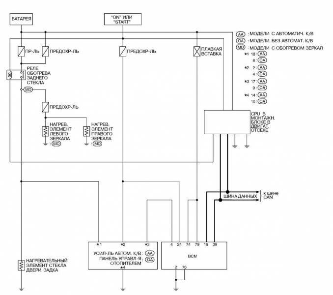 Электросхема обогрева заднего стекла и наружных зеркал