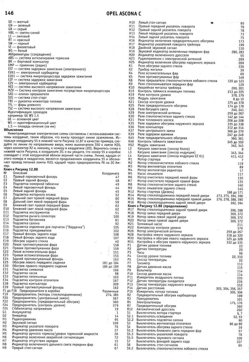Электросхемы автомобиля Опель Аскона модельного ряда 1983-1988 годов, а именно: Opel Ascona 1984, Opel Ascona 1985, Opel Ascona 1986, Opel Ascona 1987, Opel Ascona 1988. На отдельных картинках приводятся расшифровки и обозначения элементов на схемах. Наименование элементов приведены в соответствии с DIN 40719, обозначение линий в соответствии с DIN 47002. Некоторое наложение участков схем Opel Ascona C облегчает чтение. Предназначено для специализированных автомастерских.