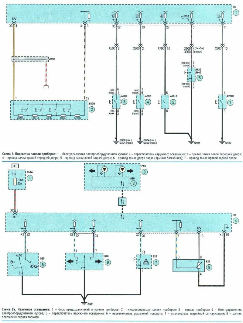 Цветные схемы электрооборудования автомобиля Chevrolet Aveo с 2011 года, модификация T300. Показаны русскоязычные схемы и соединения электрической проводки узлов приборов автомобиля Шевроле Авео. Соединение приборов, соединения звукового сигнала, стеклоочиститель и омыватель ветрового стекла, соединения стеклоподъемников передних дверей, соединения комбинации приборов, антиблокировочная система тормозов, система управления двигателем и другие. Схемы для более старой версии Aveo смотрите здесь.