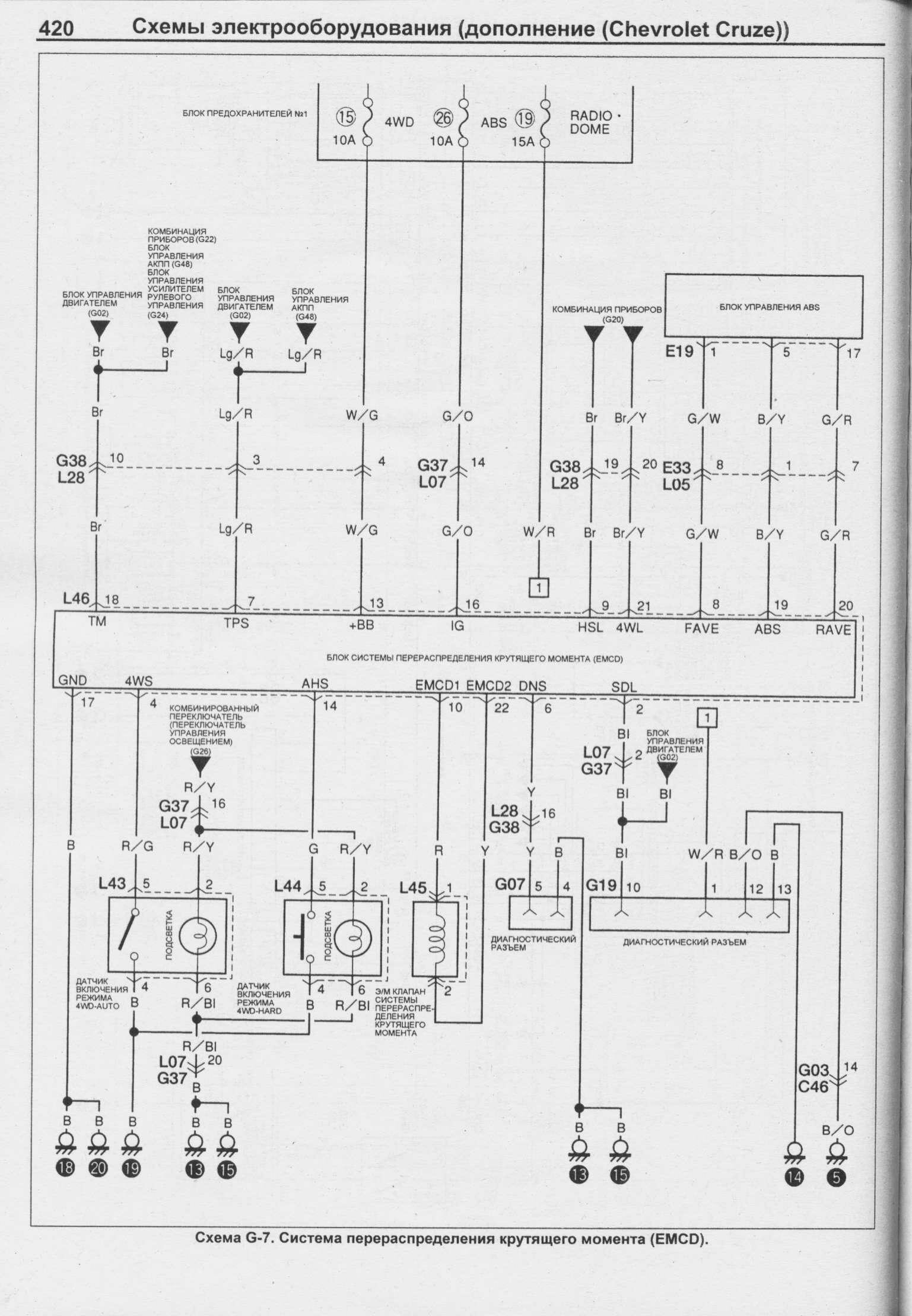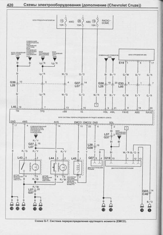 Электросхема и соединения электрической проводки и узлов приборов автомобиля шевроле - круз. Соединение приборов, соединения звукового сигнала, стеклоочиститель и омыватель ветрового стекла, соединения стеклоподъемников передних дверей, соединения комбинации приборов, антиблокировочная система тормозов, система управления двигателем Chevrolet Cruze и другие.