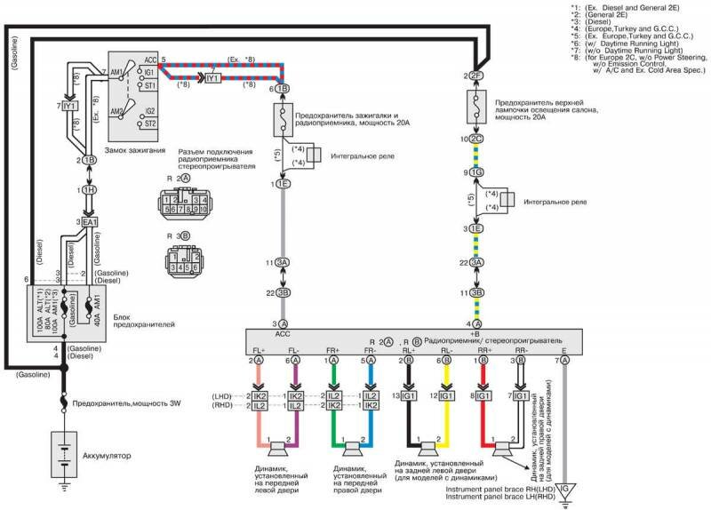 Бесплатные, цветные и качественные электросхемы автомобиля Toyota Corolla на русском языке. Представленна вторая часть, содержащая такие узлы: Электропривод зеркал заднего вида и верхнего люка, центральный замок, стеклоподъёмники, омыватели и стеклоочистители, вентилятор охлаждения радиатора и кондиционера Тойота Королла и другие. Первую часть сборника электросхем Toyota Corolla смотрите тут. Для увеличения достаточно кликнуть по схеме.